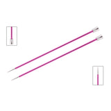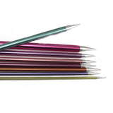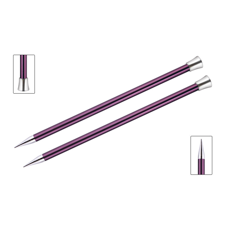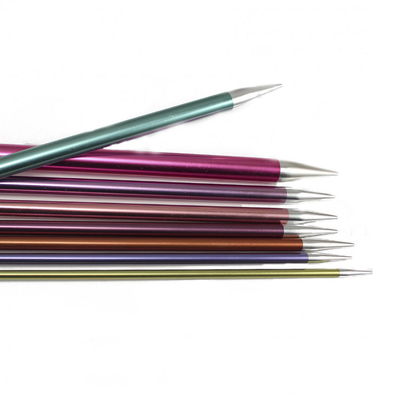 Las agujas de punto Zing KnitPro son agujas de colores vibrantes, con cuerpo de aluminio y puntas de níquel plateado.