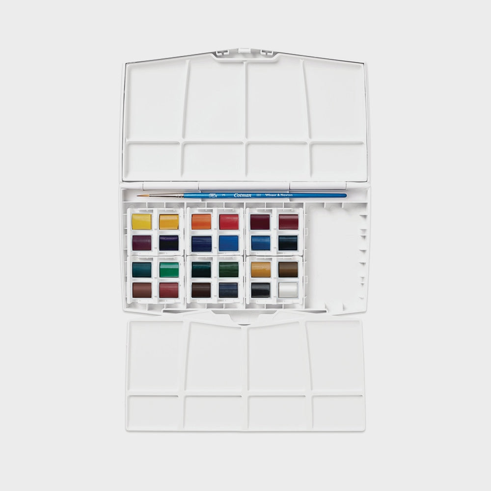 Caja 24 medias pastillas de acuarela Cotman + pincel nº3 serie 111, de Winsor & Newton.