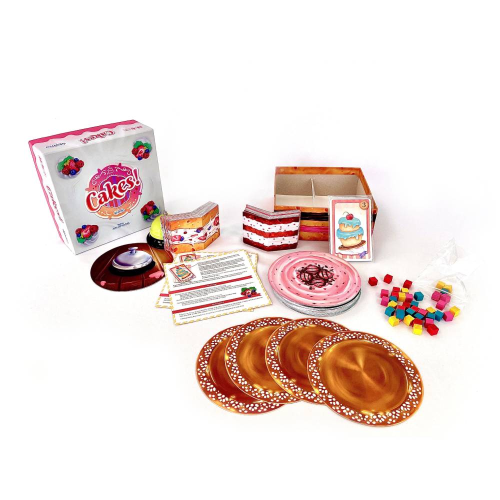 - Contenido del juego: 40 cartas redondas de cobertura, 80 cartas de bizcoche plegables, 4 bases redondas de platos, 40 cubitos de colores, 20 cartas de pedido y 1 carta de timbre