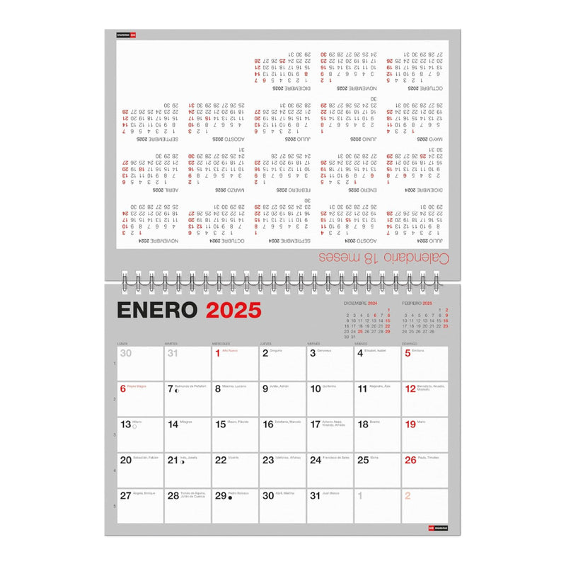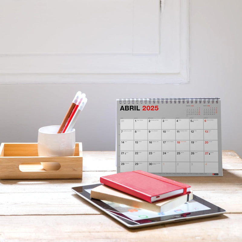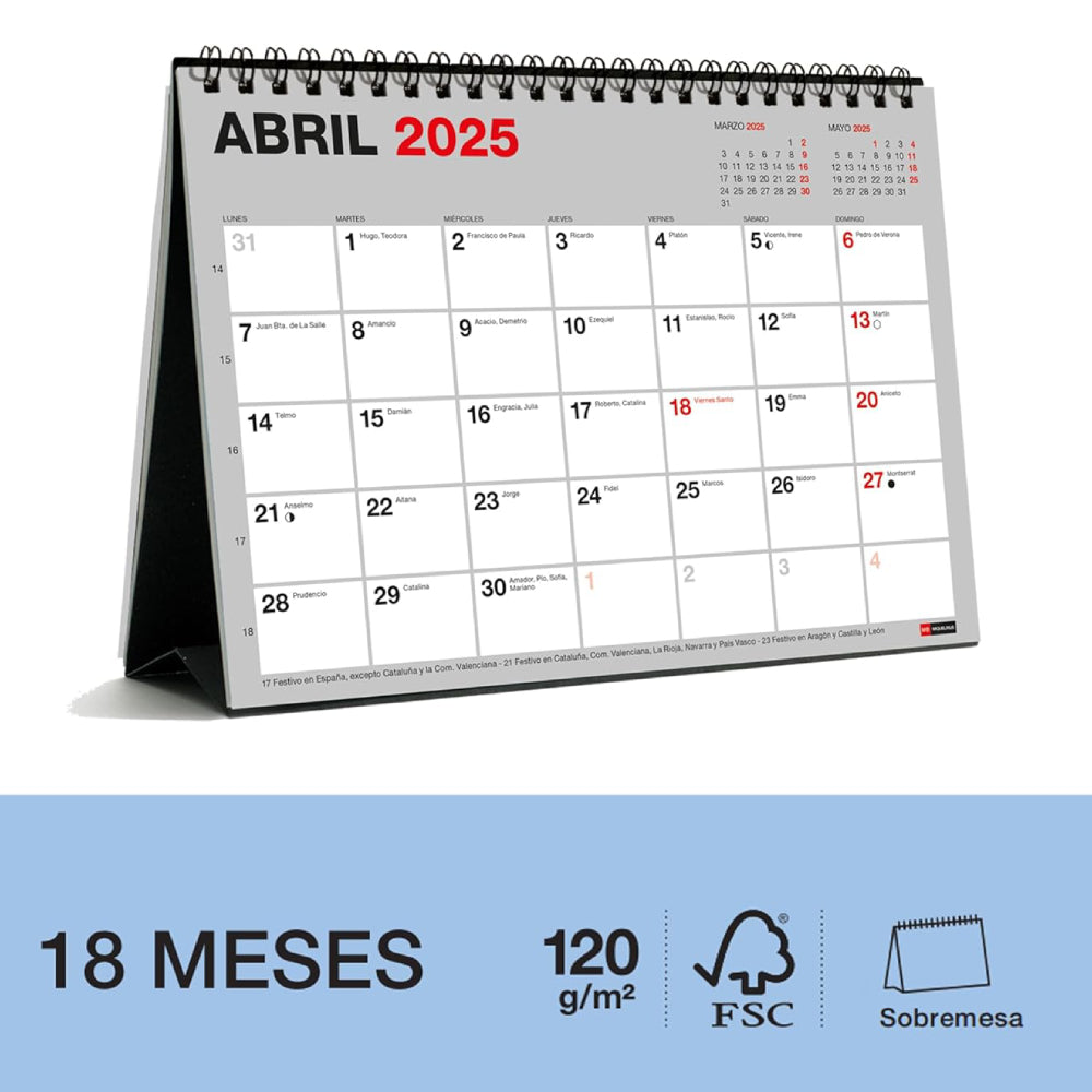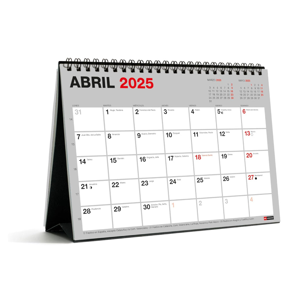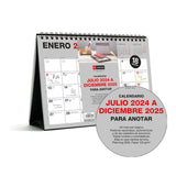 Planifica tu año con este calendario de sobremesa en formato A5. Abarca 18 meses, desde julio de 2024 hasta diciembre de 2025 y cuenta con hojas de colores con espacio para anotaciones, festivos nacionales y autonómicos, fases lunares y días de cambio de hora. Encuadernación con espiral doble proporcionando durabilidad y facilidad para pasar las páginas. Perfecto para escritorio.