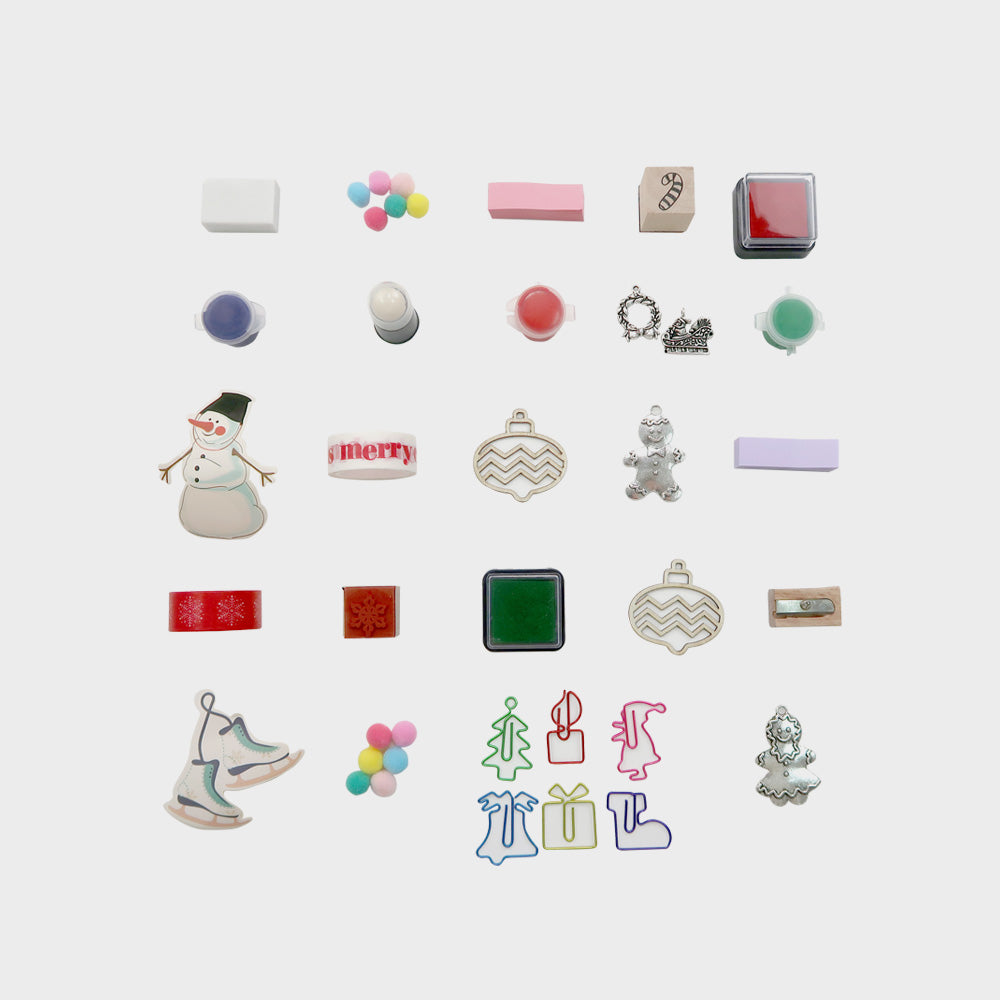 Descubre una pieza nueva cada día hasta Navidad con este Calendario de Adviento. Podrás hacer tus propios adornos navideños, decorar postales, estampar papel de regalo, pulseras navideñas, decorar regalos con pompones.