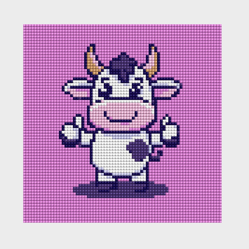 El set incluye todos los elementos necesarios para crear la obra: una lámina adhesiva con la Vaca preimpresa, un set de diamantes de colores, una bandeja para organizar las gemas, un lápiz aplicador y un cuadrado de cera adhesiva.