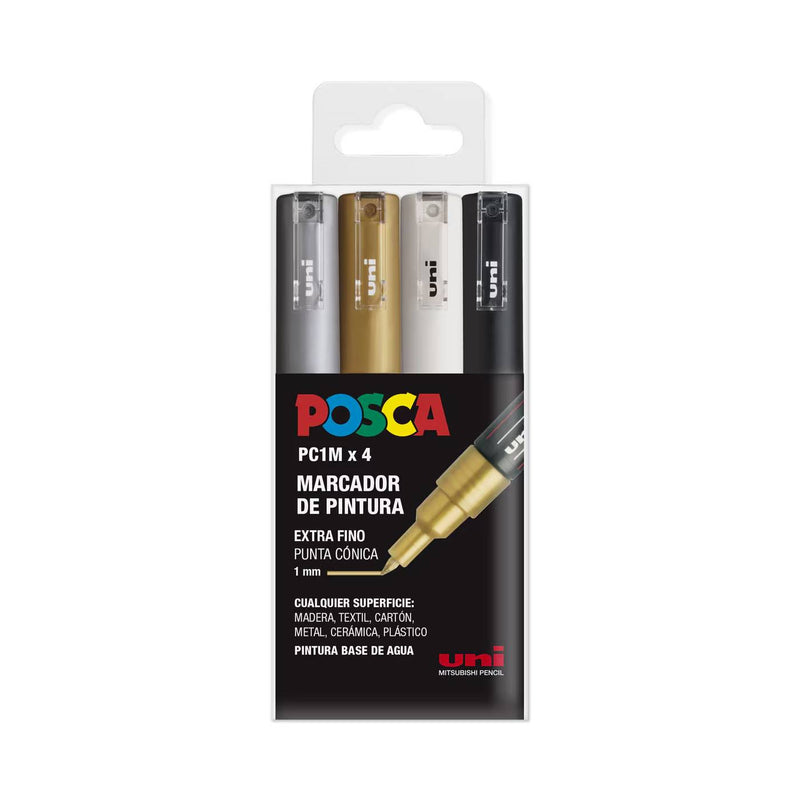 Estuche 4 rotuladores UNI POSCA PC1M de tinta pigmentada base al agua 0,7 mm, colores blanco, negro, oro, plata.