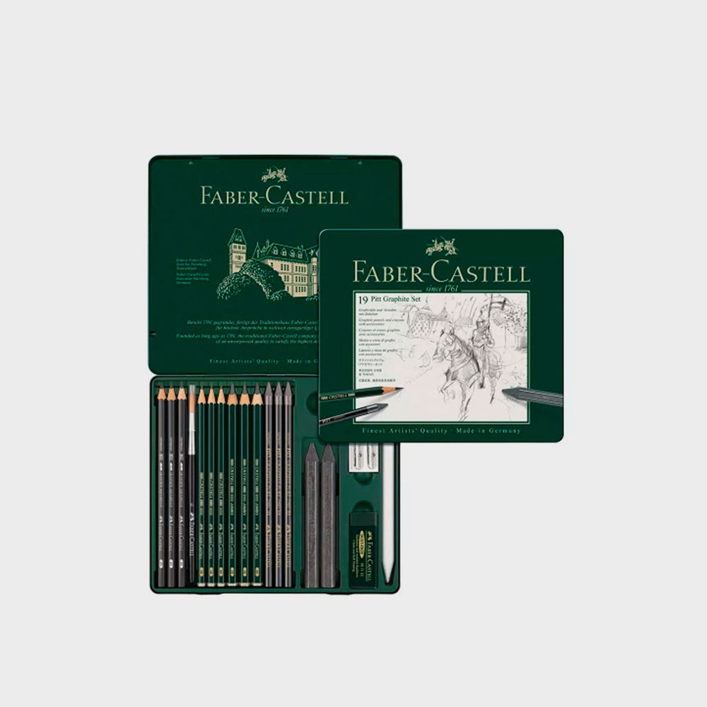Surtido completo de lápices y tizas de diferentes graduaciones para bocetos, sombreados y diseños gráficos. Contiene el "lápiz verde de Faber", así conocido por artistas de la talla de Van Gogh y Goethe, forma ya parte de nuestra vida diaria. La gama de 16 graduaciones va del gris tenue al negro grafito intenso, ofreciendo al artista toda una gama de posibilidades.