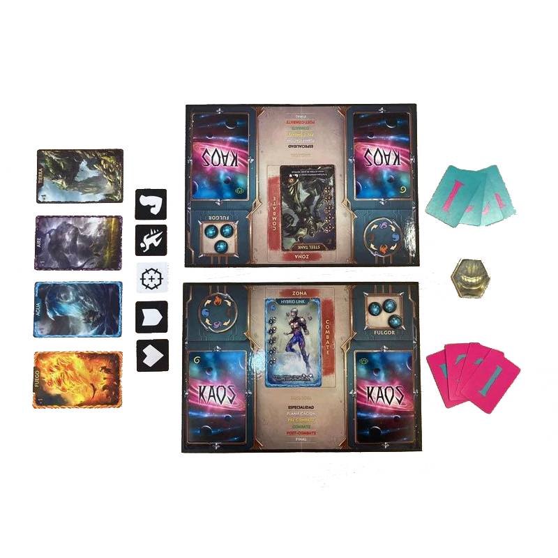 - Contenido de la caja: 36 cartas de luchadores, 4 cartas de elementos, 2 tableros, 8 mini cartas de poder, 5 mini cartas de especialidad, 6 puntos de fulgor, marcador de iniciativa