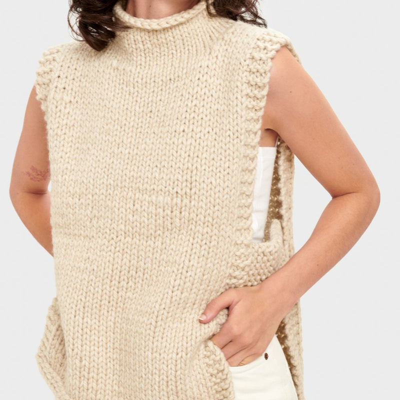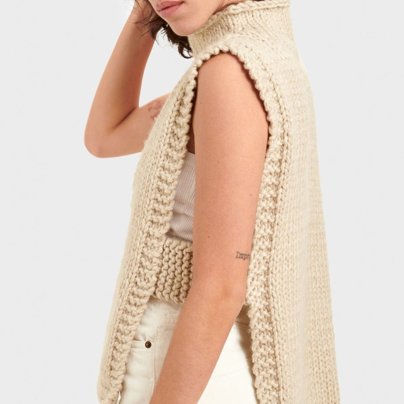 Con este nuevo Kit de chaleco de punto asimétrico con cintas laterales y cuello alto podrás practicar punto y aprender un nuevo patrón.