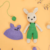Con este kit podrás crear tu propio conejito con dos prendas intercambiables: un vestido morado y un peto verde.