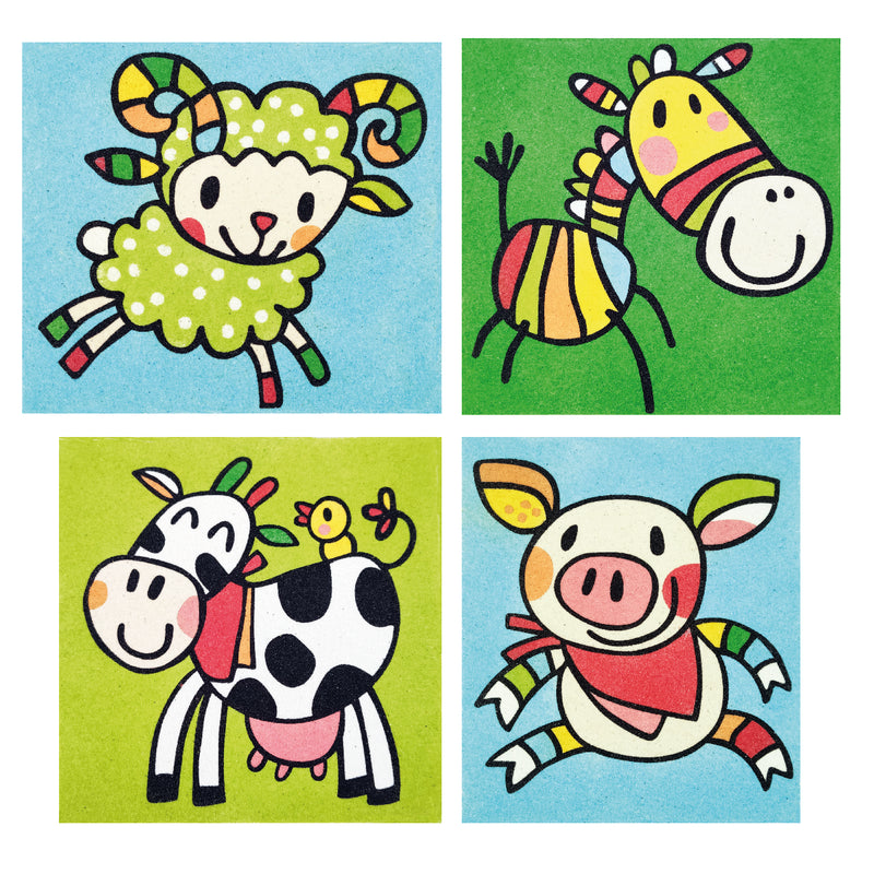 Este kit contiene todos los materiales necesarios para completar los diseños. Incluye 4 láminas adhesivas con dibujos de animales de granja: una vaca, una oveja, una jirafa y un cerdito. Además, la técnica de pintar con arenas es muy simple, tan sólo tendrás que poner la arena de colores sobre la sección que quieras colorear y sellarlo con los dedos apretando ligeramente. Al finalizar, se recomienda aplicar una capa de barniz en spray para fijar el cuadro. ¡Es el proyecto ideal para niños a partir de 10 años!