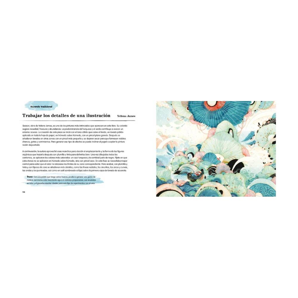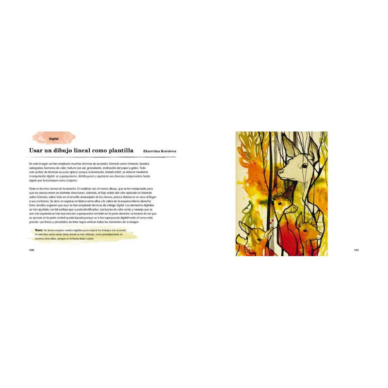 Helen recopila en esta libro más de 80 recursos plásticos realizados con acuarelas y técnicas mixtas como el gouache, tintas... todos ellos explicados con estupendos ejemplos de los artistas más reconocidos de la ilustración contemporánea.