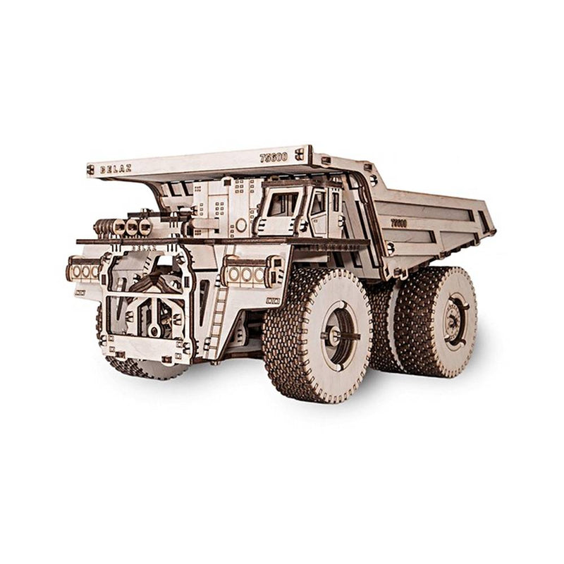 Este set de maqueta contiene 307 piezas de madera para construir un puzzle mecánico 3D con forma de camión. Está equipado con un motor de banda elástica y la parte trasera está conectada a un mecanismo de banda de goma, que mediante un botón, levanta su parte trasera.