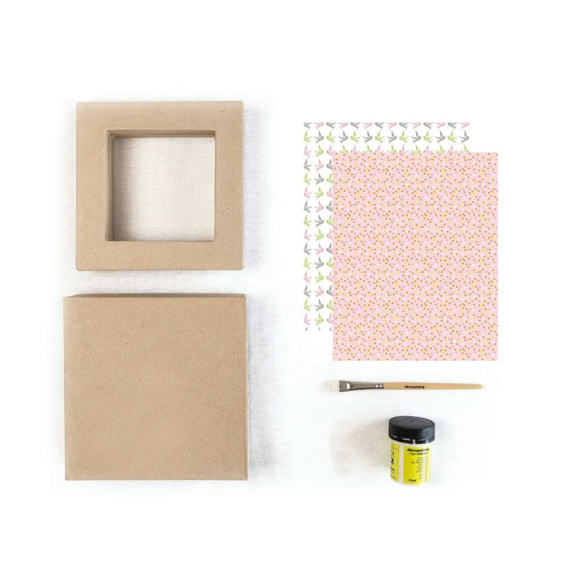 Contenido: 2 papeles decorativos 30 x 40 cm, 1 pincel nº10 Décopatch, 1 soporte con forma de marco, 1 barniz-pegamento e instrucciones de uso.