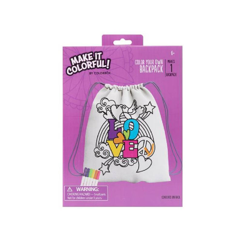 Mochila para colorear con los rotuladores de tela que vienen incorporados. Pinta a tu gusto el dibujo creativo "Love" o si lo prefieres, sigue el patrón que viene como ejemplo incorporado en la caja.