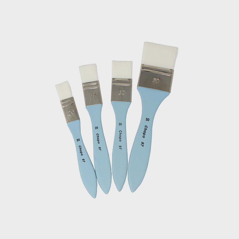 Paletina de punta plana, mango corto y pelo sintético. Suavidad excepcional con pelo de dureza media-alta. Apropiada para fondos, imprimaciones y barnizados.