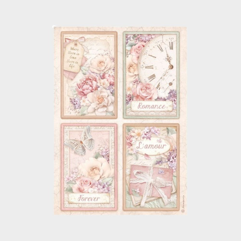 Papel Arroz, Colección Romance Forever modelo 4 Tarjetas de la marca Stamperia.