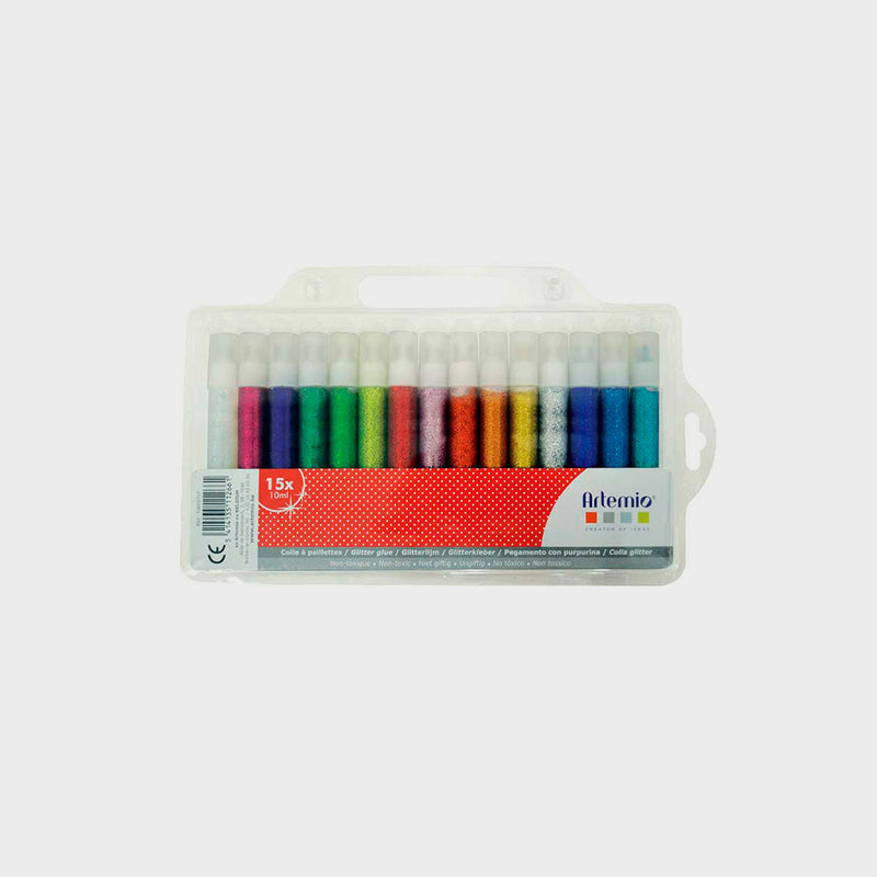 15 botes de Pegamento de Purpurina de Varios Colores de 10ml de la marca Artemio.