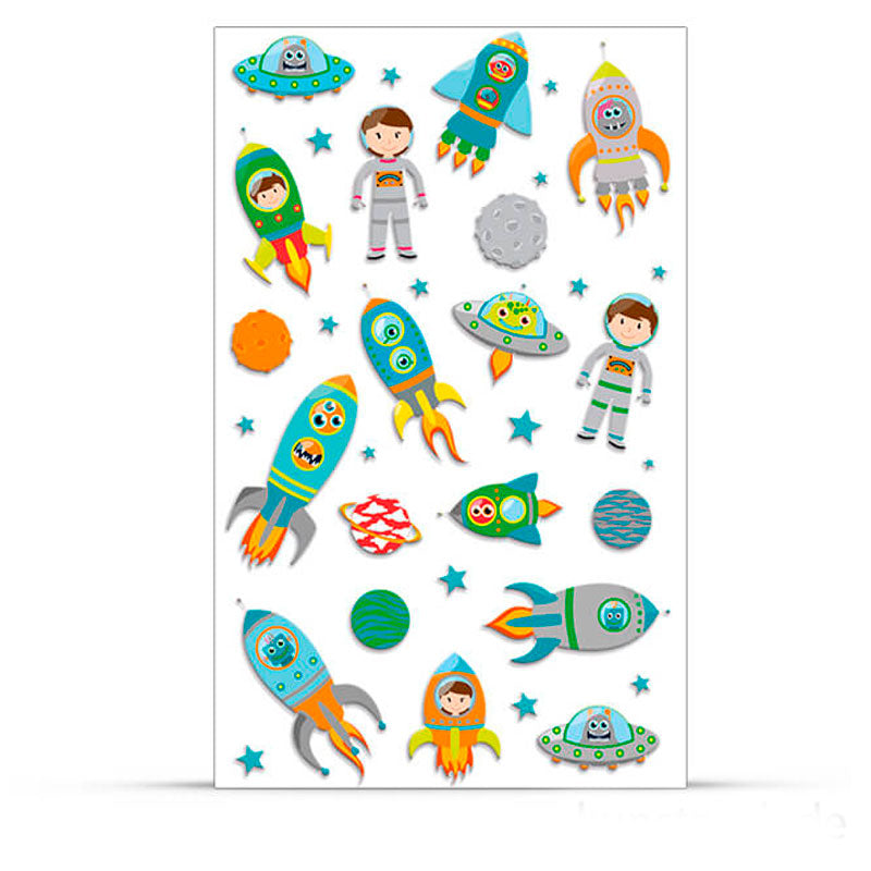 Contiene pegatinas del espacio para decorar y personalizar todo tipo de materiales.