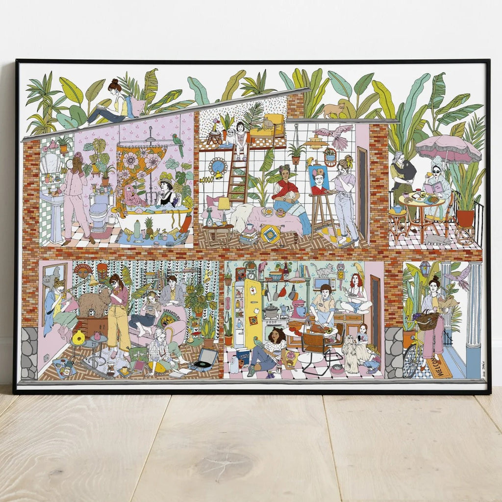 La artista Ana Jarén ilustra una serie de escenas cotidianas dentro de una casa, con mujeres y animales como protagonistas. Ideal para colorear mientras te relajas y potencias tus capacidades artísticas, este Póster gigante para pintar será el regalo perfecto. ¡Descúbrelo!