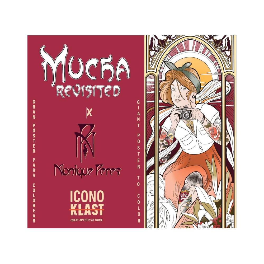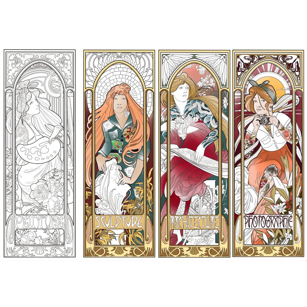 Esta ilustración Art Noveau inspirada en el artista Alfons Mucha es el diseño perfecto para este Póster gigante para colorear. La artista Monique Peres le da un toque moderno al estilo que gobernó a finales del del siglo XIX y principios del siglo XX.