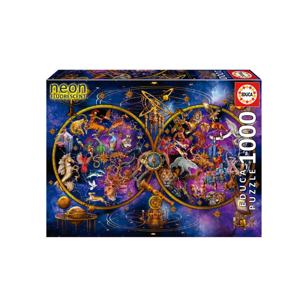 Explora el universo y los signos del zodiaco con este Puzzle Educa de 1000 Piezas Constelaciones Neon. Cada pieza revela constelaciones brillantes y sus correspondientes signos zodiacales sobre un fondo oscuro, creando un montaje fascinante y lleno de energía visual.