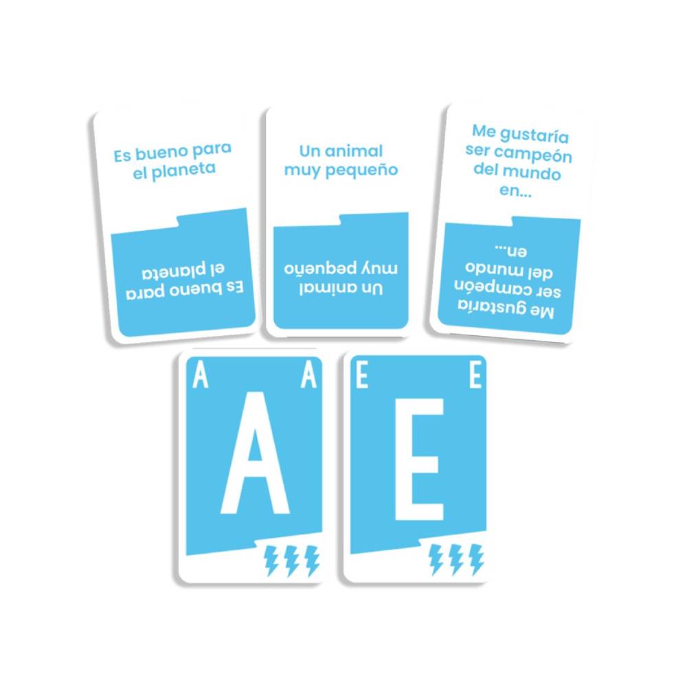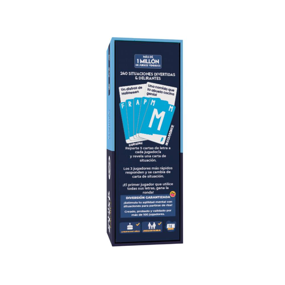 A cada jugador se le reparten 5 cartas de letra, después, se revela una carta de situación y todos debéis responder empleando una de las letras de vuestro mazo. ¡Intenta ser el más rápido en responder! Cuando las 3 personas más rápidas hayan dicho su respuesta, se cambia la carta de situación. ¡El que antes se quede sin cartas de letra gana la ronda!