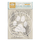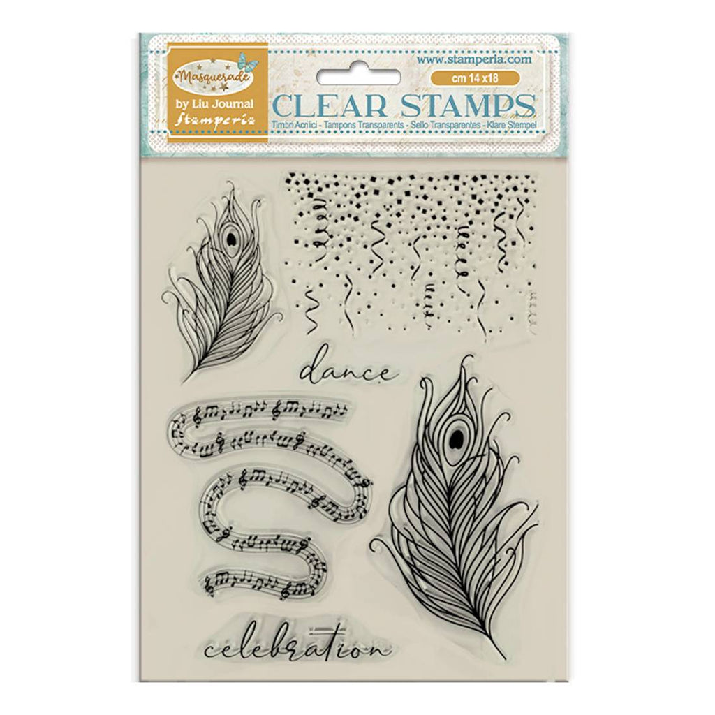 Pack de 6 Sellos Acrílicos Transparentes en formas de Plumas 'Masquerade' de la marca Stamperia