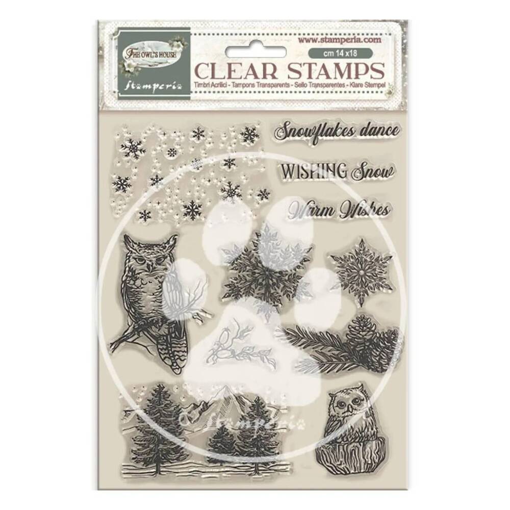 Pack de 11 Sellos Acrílicos en forma de Búhos y Copos de Nieve de la colección The Owl's House de marca Stamperia