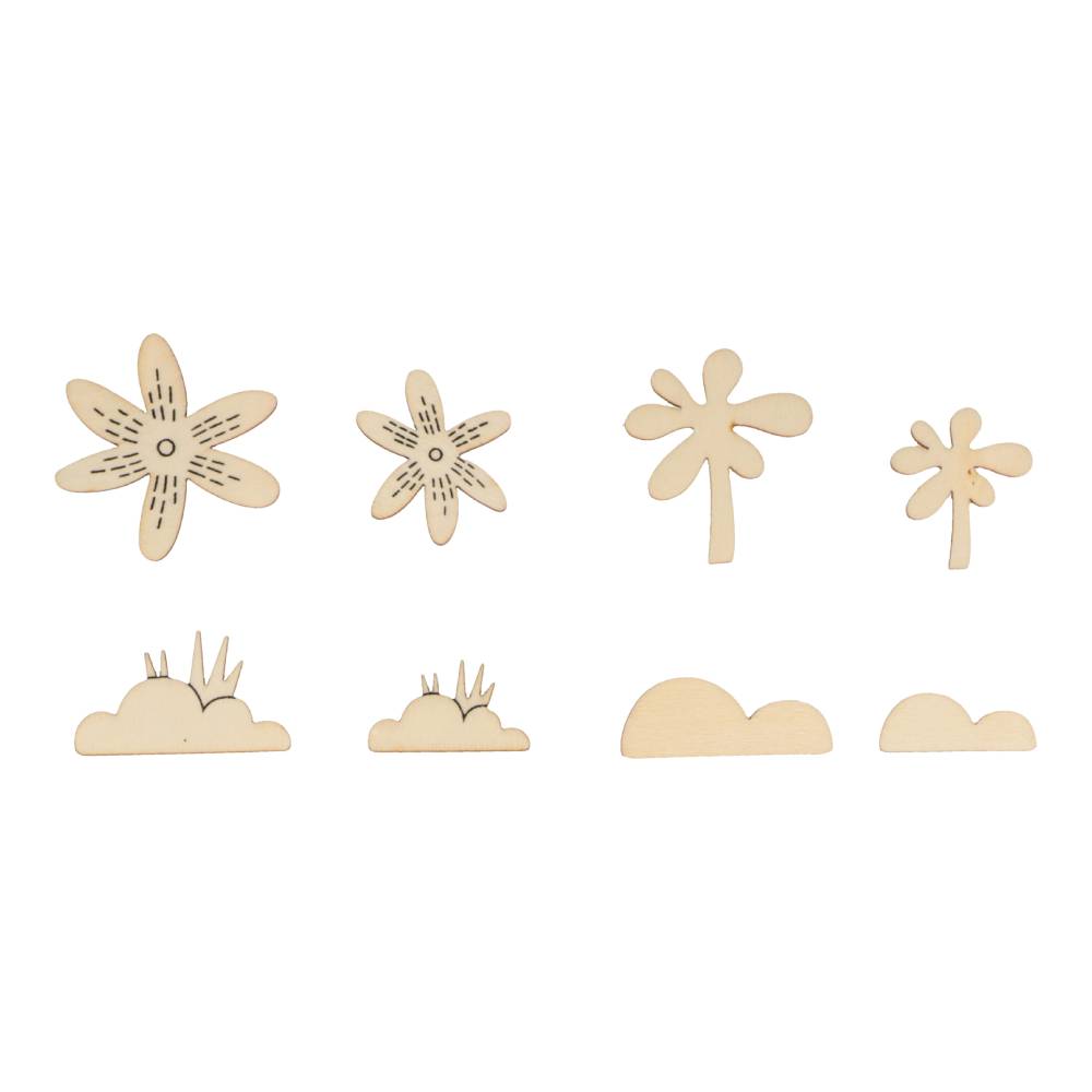 Estos adornos de madera son perfectos para tus proyectos de scrapbooking y tarjetas. Sus formas son de plantas y hojas.
