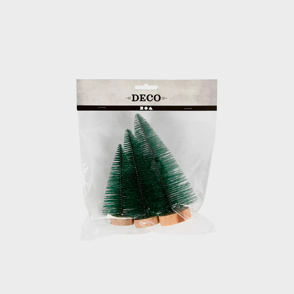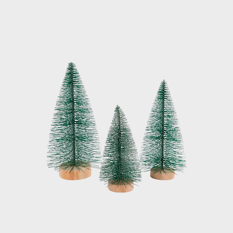 Decora la navidad con estos 3 pequeños abetos. Cada uno esta montado sobre una base de madera que viene incluida. Ideal para paisajes navideños.