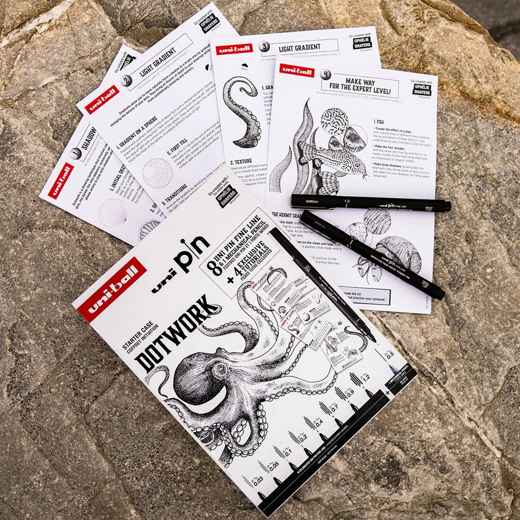 Este set incluye 8 Rotuladores Calibrados Uni-Pin en color negro + 1 Portaminas, además de 4 tutoriales exclusivos con información recopilada por la artista Ophélie Dhayere (@heyophelie) que te enseñarán todo lo que has de saber sobre el Puntillismo.