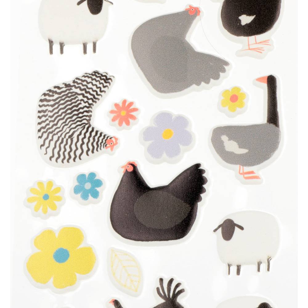 Con este set de clear stickers podrás decorar todos tus proyectos de scrap y manualidades. El set contiene pegatinas inspiradas en la naturaleza y los animales como patos, ocas, gallinas y ovejas. Cuentan con el efecto puffy, una textura acolchada y con relieve.