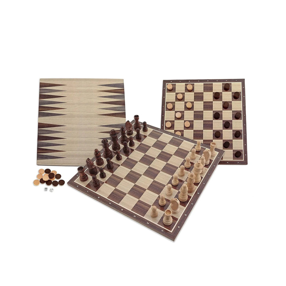 Fabricado con madera sostenible, este tablero tiene las casillas de ajedrez/damas por un lado y el tablero del backgammon por otro. Contiene todas las fichas necesarias para jugar a los 3 juegos.