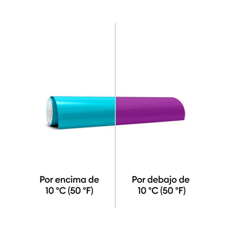 El vinilo Cricut con cambio de color activado por frío cambia de color a temperaturas inferiores a 10 °C. Aplícalo en vasos, tazas o llénalo con una bebida muy frío.