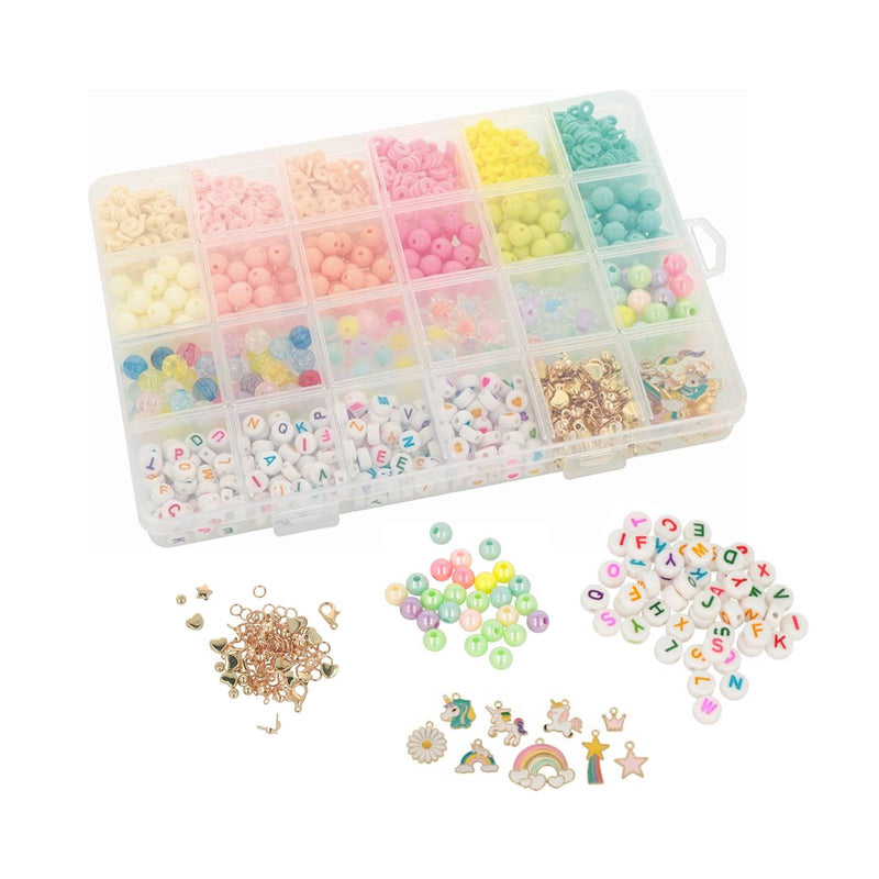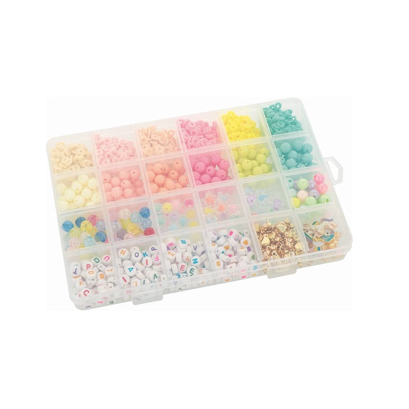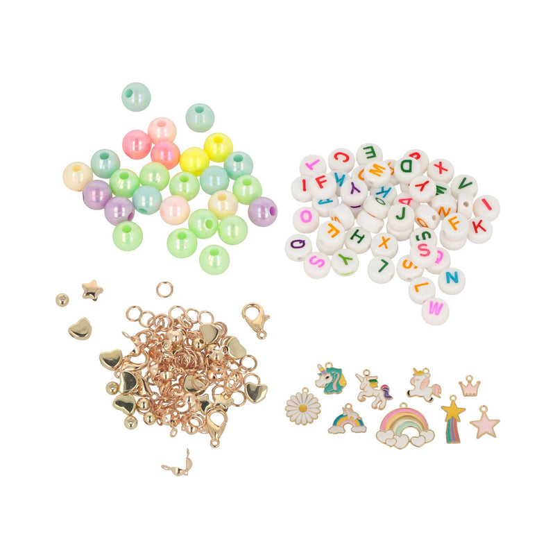 Aqui encontrará uma variedade de até 1.300 contas em tons pastel, perfeitas para qualquer projeto criativo de joalharia que esteja a planear. Inclui contas redondas, planas, com glitter, semitransparentes, contas com letras do alfabeto e berloques com o tema dos contos de fadas. As suas possibilidades criativas são infinitas com este conjunto de contas para pulseira da amizade!