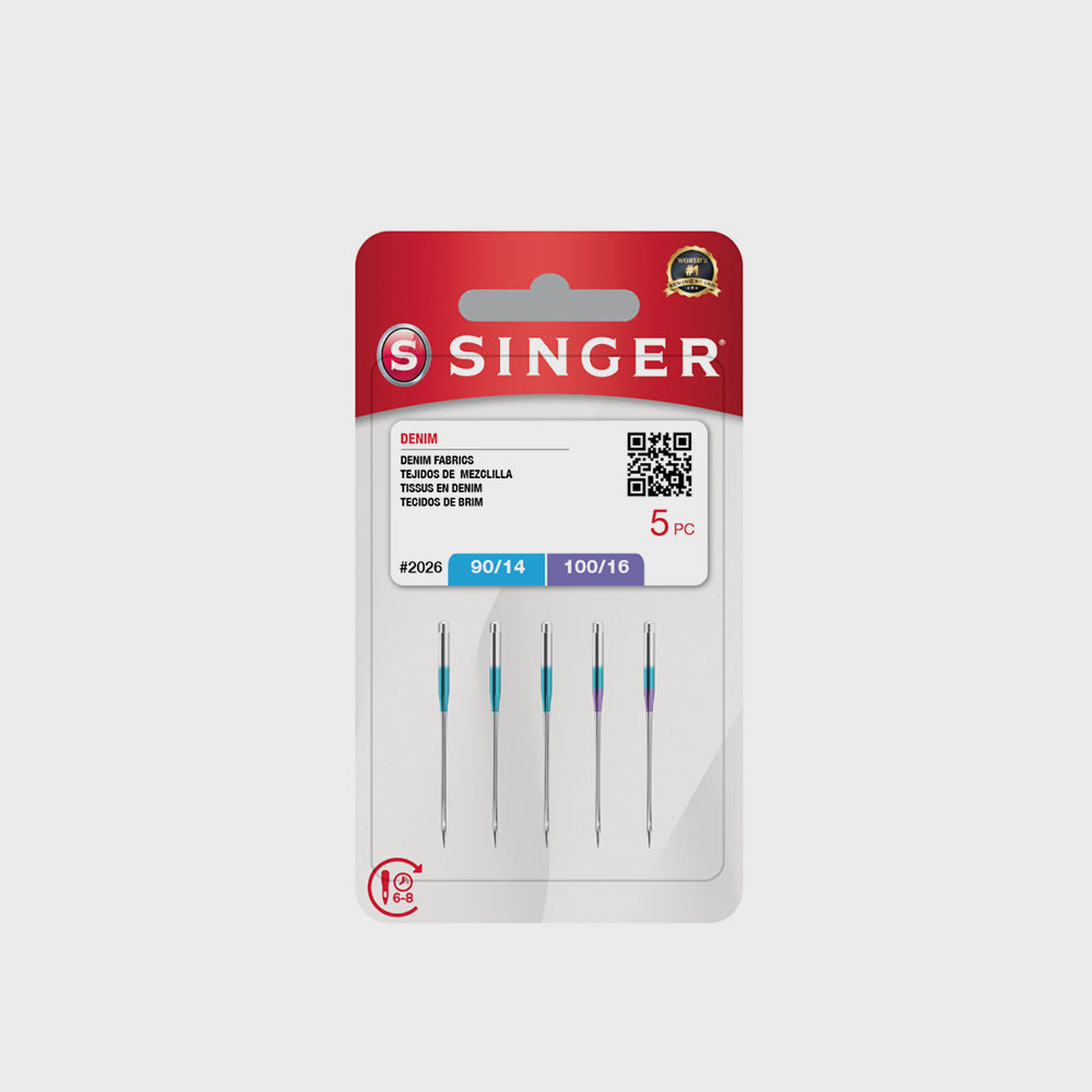 Este conjunto de 5 agulhas de costura para maquina e simplesmente incrível para quem adora trabalhar com tecidos de ganga! Com ponta redonda afiada, estas agulhas da marca SINGER vêm em 2 tamanhos diferentes para se adaptarem a diferentes espessuras de tecido. Feitas com materiais de alta qualidade, sao super resistentes e duradouras, garantindo que as as tuas costuras fiquem impecaveis. Com cabos redondos e planos, sao compatíveis com a maioria das maquinas de costura disponíveis no mercado, como Singer, Alfa, Brother, Juki, Elna, Silvercrest, AEG...