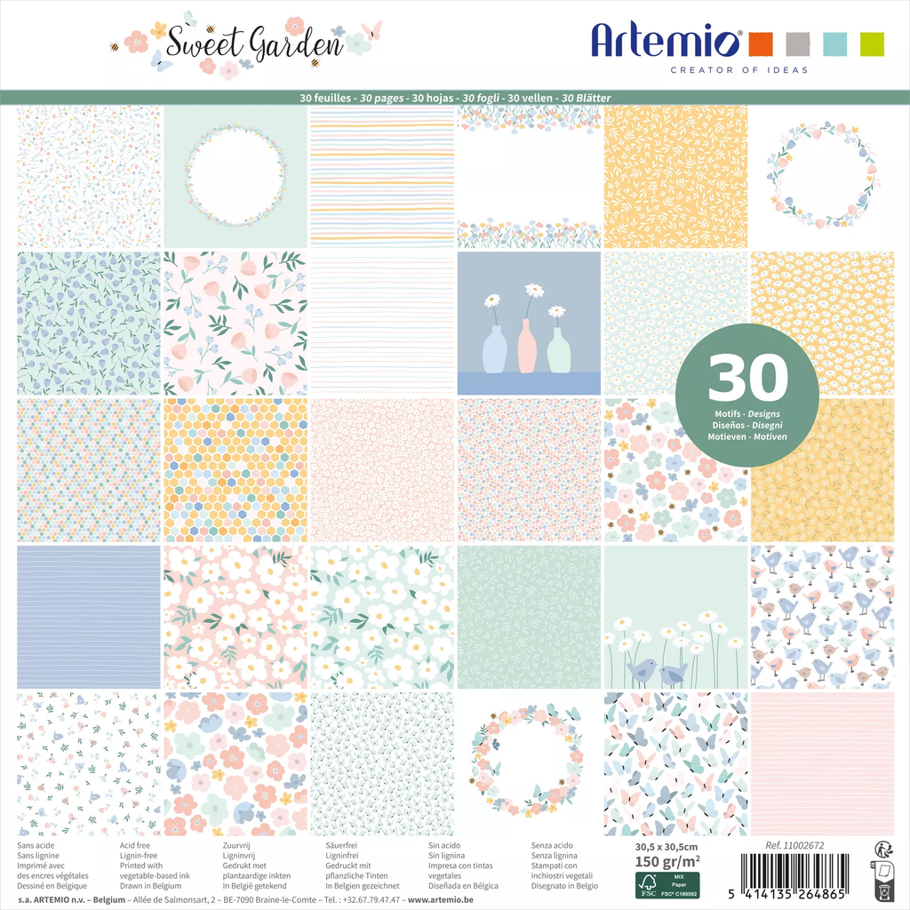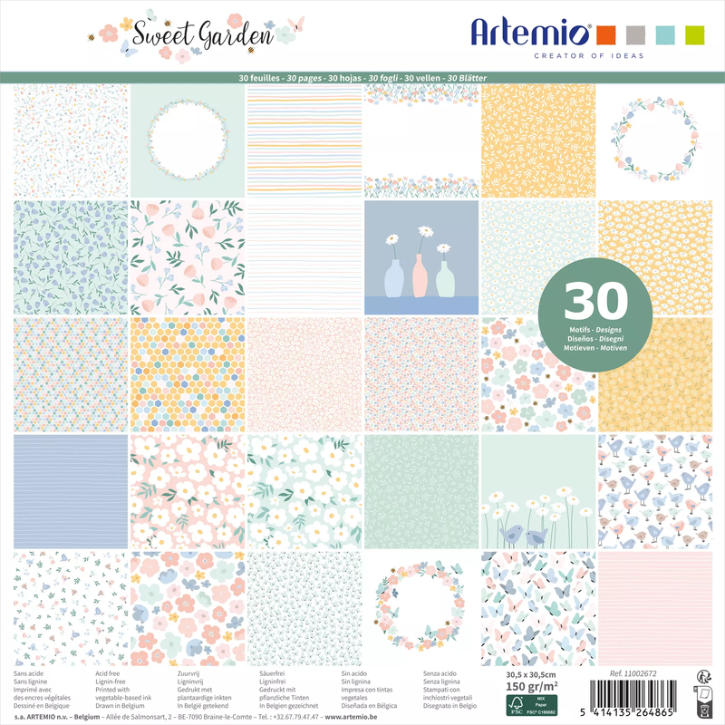 Desfrute deste bloco de scrapbooking com 30 folhas da coleção Sweet Garden da Artemio . Estes designs estão disponíveis em cores e tons pastel , com 30x30 cm, perfeitos para os seus projetos de scrapbooking.