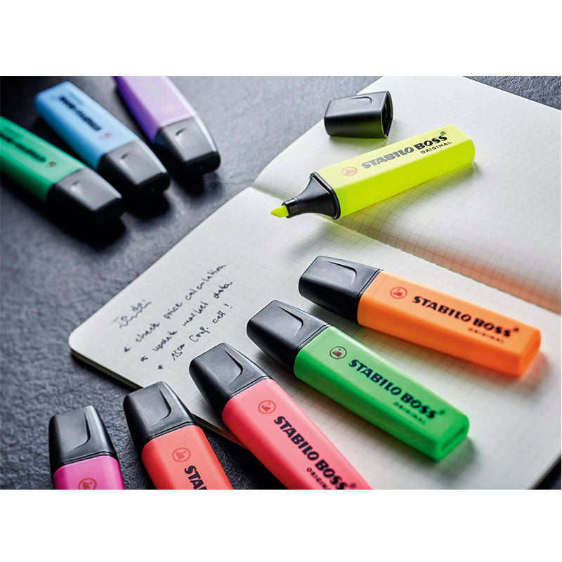 Este estojo de 6 marcadores Original Boss Stabilo e simplesmente incrível! Com o design classico da Stabilo desde 1971, o Stabilo Boss Original e perfeito para ti, que precisas de te concentrar no essencial enquanto lês ou trabalhas. Com a tecnologia Anti Secagem STABILO, podes deixar destapado ate 4 horas sem que seque, garantindo um trabalho concentrado. Este marcador esta disponível em 9 cores fluorescentes e 14 cores pastel, todos à base de agua. Alem disso, e recarregavel de forma facil e economica, promovendo a sustentabilidade ao utilizar material reciclado. Com dois tamanhos de traco diferentes (2 + 5 mm), este conjunto de 6 marcadores vai tornar as as tuas notas e destaques ainda mais vibrantes e organizados. Ideal para o teu material escolar ou para oferecer a alguem especial, este estojo e um must have para quem valoriza a qualidade e a praticidade.