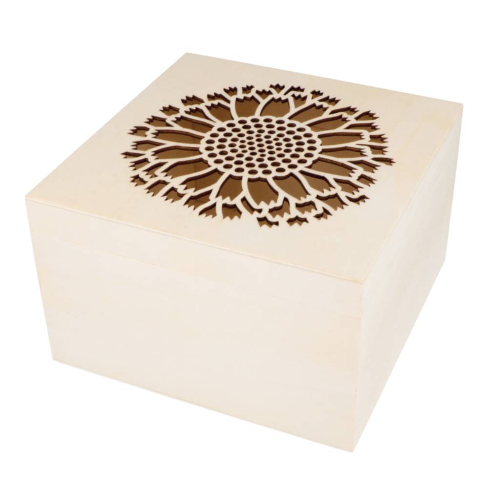 Caixa quadrada em madeira Girassol, tamanho 10x16x16cm, Coleção Botânica da marca Artemio.