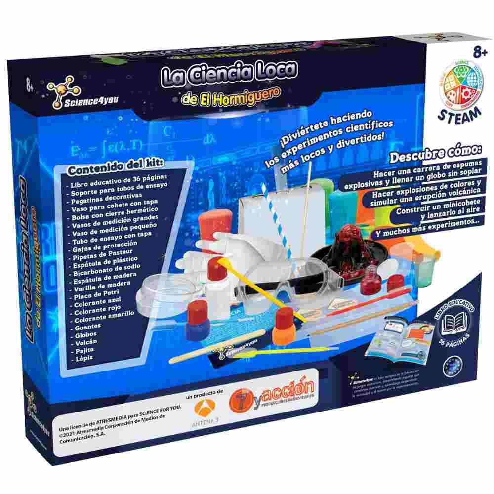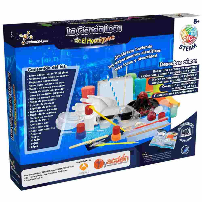 Explora o mundo da ciência com o kit A Ciência Louca O Hormiguero Science4You da marca Science4You. Com este kit, as tuas criancas poderao realizar experimentos incríveis, inspirados no programa El Hormiguero da Antena 3. Desde uma corrida de espumas que explodem, explosoes de diferentes cores, encher um balao para soprar, simular a erupcao de um vulcao, ate lancar um pequeno foguete, ha tantas experiências divertidas e educativas para descobrires! Este kit e o presente perfeito, combinando diversao e aprendizagem. Com um livro educativo de 36 paginas, suporte para tubos de ensaio, pegatinas decorativas, vaso para foguete com tampa, bolsa hermetica, vasos de medicao grandes e pequenos, tubo de ensaio com tampa, oculos de protecao, pipetas de Pasteur, espatula de madeira, varilla de madeira, placa de Petri, corantes azul, vermelho e amarelo, luvas, baloes, vulcao, palhinha e lapis, este kit e ideal para criancas a partir dos 8 anos. Diverte te a aprender ciência de forma pratica e emocionante!