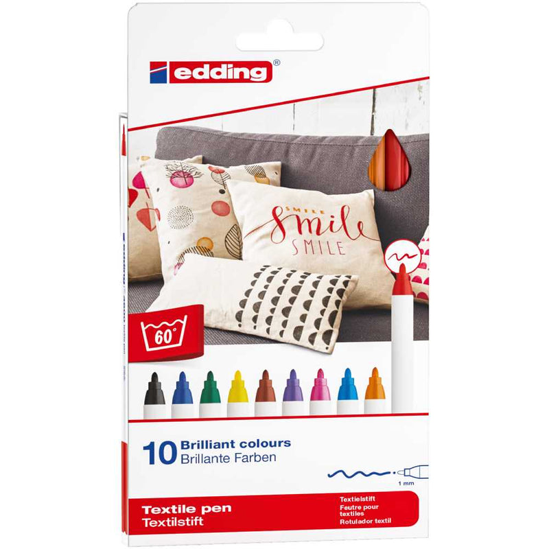 Este conjunto de 10 marcadores têxteis da marca Edding, modelo 4600, e simplesmente incrível! Com estes marcadores, as as tuas possibilidades de personalizacao sao infinitas. Podes escrever, desenhar, criar padroes e motivos decorativos em tecidos de cores claras, como camisolas, almofadas, porta chaves e guardanapos. A ponta redonda de 1 mm permite te ter precisao nos teus desenhos e mensagens. A tinta pigmentada à base de agua seca rapidamente, e inodora e extremamente resistente à luz, garantindo que as as tuas criacoes durem por muito tempo. Alem disso, a tinta e resistente à lavagem ate 60 °C, desde que fixada com um ferro de passar (sem vapor). Com estes marcadores, a tua criatividade nao tera limites!
