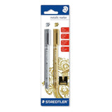 Este conjunto de 2 Marcadores Metalicos Staedtler e simplesmente incrível! Com uma caneta de ouro e outra de prata, sao perfeitas para dar um toque especial aos teus projetos de belas artes. Com uma ponta de 1 2 mm, sao ideais para escrever e decorar em papeis e cartolinas escuras e claras. Perfeitos para scrapbooking e cartoes de felicitacao, estes marcadores nao precisam de agitacao ou bombeamento, e podem ser facilmente apagados de superfícies lisas como vidros e espelhos com um pano úmido. Com estes marcadores, as as tuas criacoes vao ganhar um brilho extra e um toque de elegância. Adquire ja o teu conjunto de 2 Marcadores Metalicos Staedtler e deixa a tua criatividade fluir!