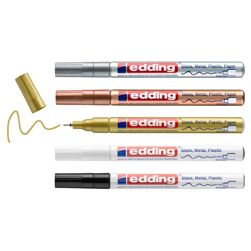 Este conjunto de 5 marcadores permanentes Edding 780 Metalicos e simplesmente incrível! Com cores branco, preto, ouro, prata e cobre, estes marcadores de ponta fina sao ideais para todas as as tuas necessidades de rotulagem. A tinta opaca de alta cobertura adere perfeitamente a uma variedade de materiais, desde plastico a vidro e metal, garantindo resultados duradouros e vibrantes. Com uma ponta de 0,8 mm, estes marcadores secam rapidamente e sao resistentes ao calor, à agua e à luz. Alem disso, os tons branco e prateado permanecem visíveis ate 1000 °C, tornando os ideais para uma variedade de projetos artísticos e criativos. Com um corpo de alumínio de alta qualidade e uma tinta praticamente sem cheiro, estes marcadores sao a escolha perfeita para os teus projetos de belas artes. Adquire ja o teu conjunto e da asas à tua criatividade!