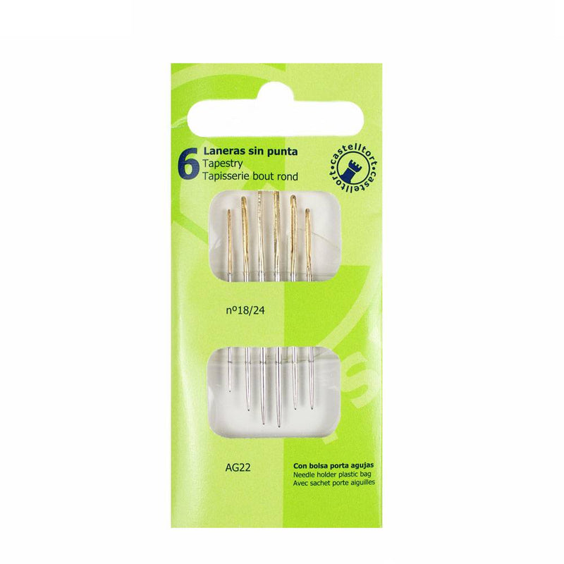 Este conjunto de 6 agulhas de ponto cruz da marca Castelltort e uma adicao essencial à tua caixa de costura. Com o seu olho grande e ponta redonda, estas agulhas lanosas sao perfeitas para finalizar os teus projetos de ponto e croche, escondendo os teus fios soltos com facilidade. Feitas em aco com o olho dourado, sao ideais para bordar e fazer ponto cruz com la em tela e tapecaria. Com tamanhos que vao do nº18 ao nº24, estas agulhas sao versateis e praticas para a tua maquina de costura. Adquire ja o teu blister de 6 agulhas e prepara te para dar vida aos teus projetos de costura!