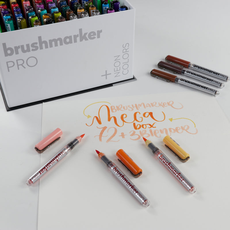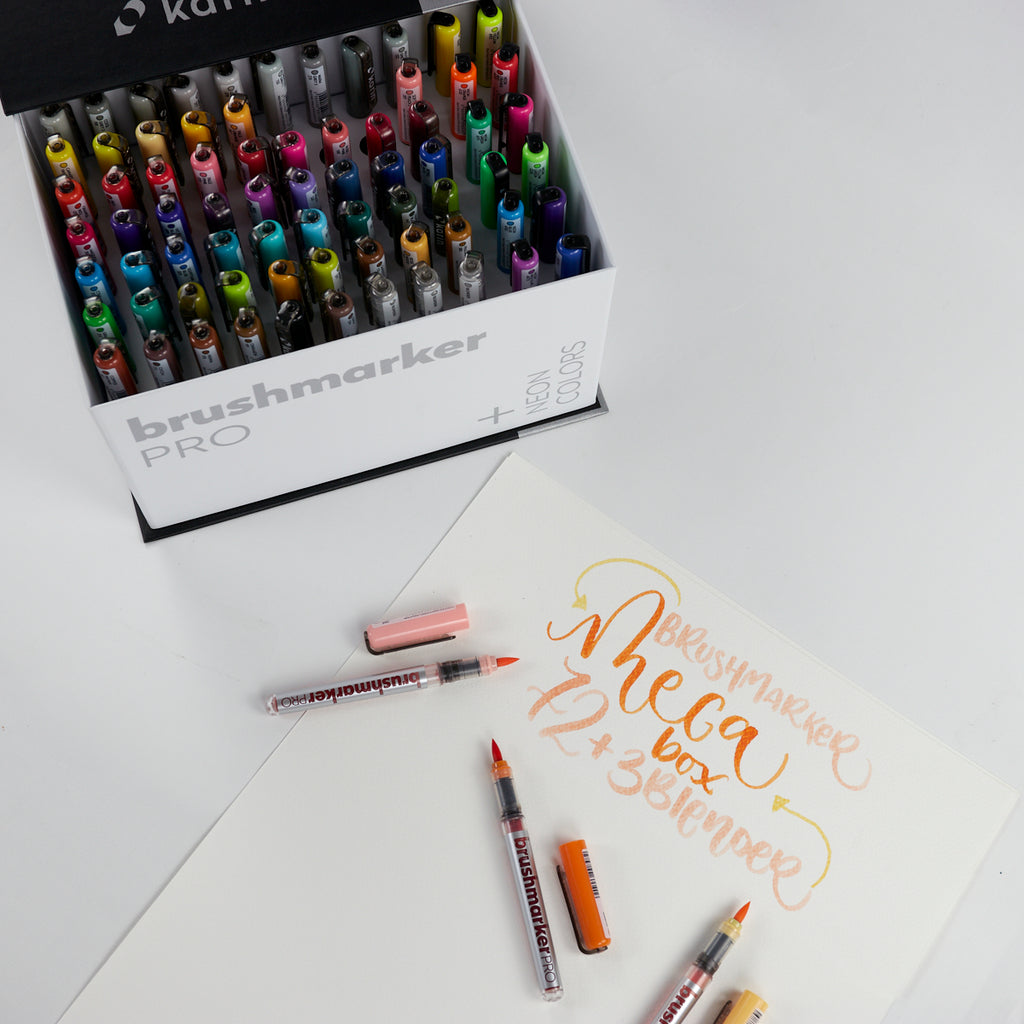 Esta megabox contém 75 canetas Karin Brushmarker Pro , com as 60 cores da linha completa de marcadores + 12 cores neon + 3 liquidificadores ou misturadores.