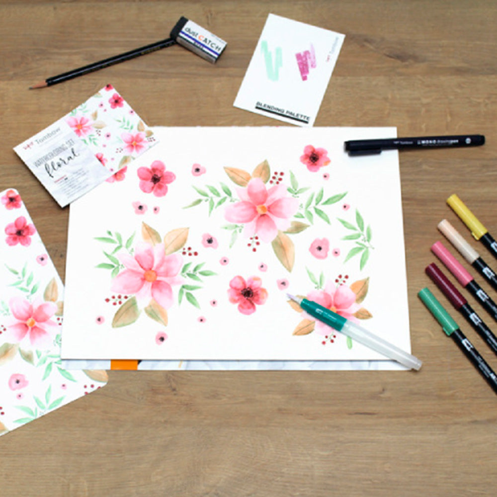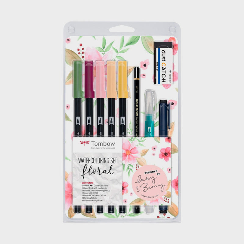 Conjunto de letras florais, composto por 5 marcadores com pontas de pincel, lápis, borracha, delineador e pincel de água, da marca Tombow.