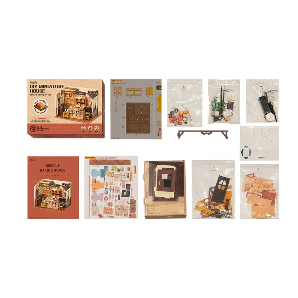 La maqueta Rolife Becka’s Baking House es un encantador modelo de casa en miniatura inspirada en una acogedora panadería. Cada pieza viene organizada en bolsas numeradas y acompañada de un manual ilustrado para facilitar el ensamblaje. Los materiales son resistentes, suaves al tacto y seguros: madera, papel y plástico sin rebabas ni olores.