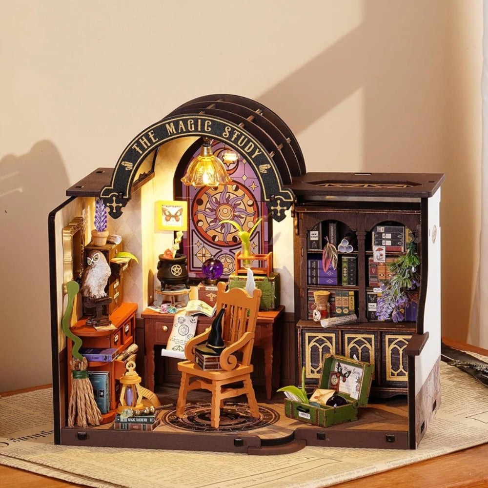 Descubre la magia con el Estudio Mágico de Rolife de la marca Robotime, una encantadora casa en miniatura DIY que te invita a adentrarte en el misterioso mundo de la hechicería. Con 267 piezas cortadas con precisión láser, este kit recrea el estudio de un auténtico mago, lleno de detalles fascinantes: un antiguo libro de hechizos, una bola de cristal para la adivinación, una biblioteca encantada y un baúl repleto de pociones y secretos.