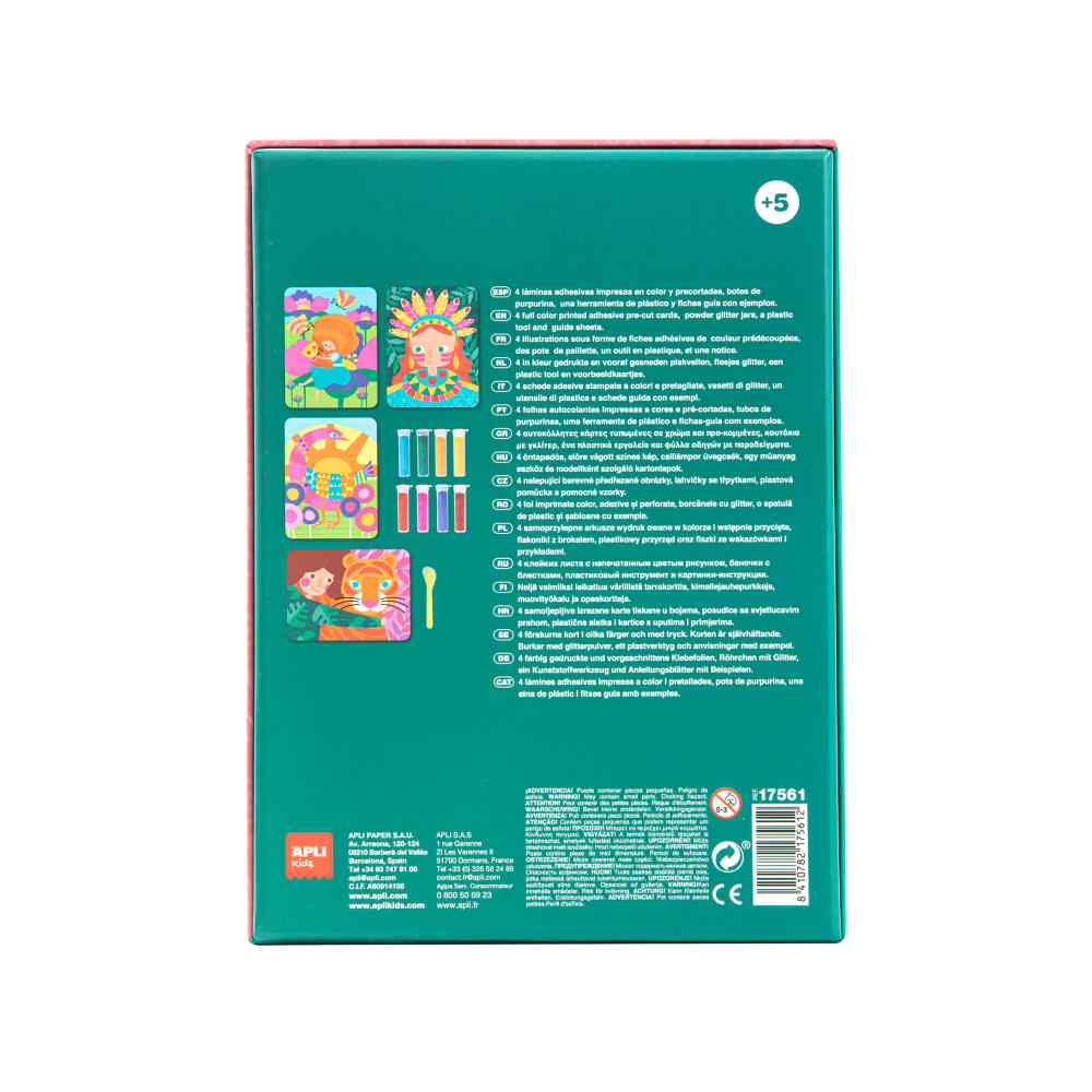 Neste incrível Jogo Glitter Art da marca Apli Kids Kids, as tuas criancas vao poder soltar a imaginacao e criar quadros brilhantes e coloridos de forma super divertida! Com quatro fichas pre impressas em cores vibrantes, oito potes de purpurina em diferentes tons e uma pratica ferramenta de plastico, este jogo estimula a psicomotricidade fina, desenvolve a criatividade, a destreza manual e o sentido das cores. Alem disso, ajuda no enriquecimento pessoal ao permitir a criacao de trabalhos manuais únicos e especiais. Recomendado para criancas a partir dos 5 anos, este jogo educativo e perfeito para atividades lúdicas e de aprendizagem. Lembra te de sempre utilizar sob a supervisao de um adulto, pois contem pecas pequenas que podem representar perigo de asfixia. Com o Jogo Glitter Art Apli Kids, a diversao e a criatividade estao garantidas!