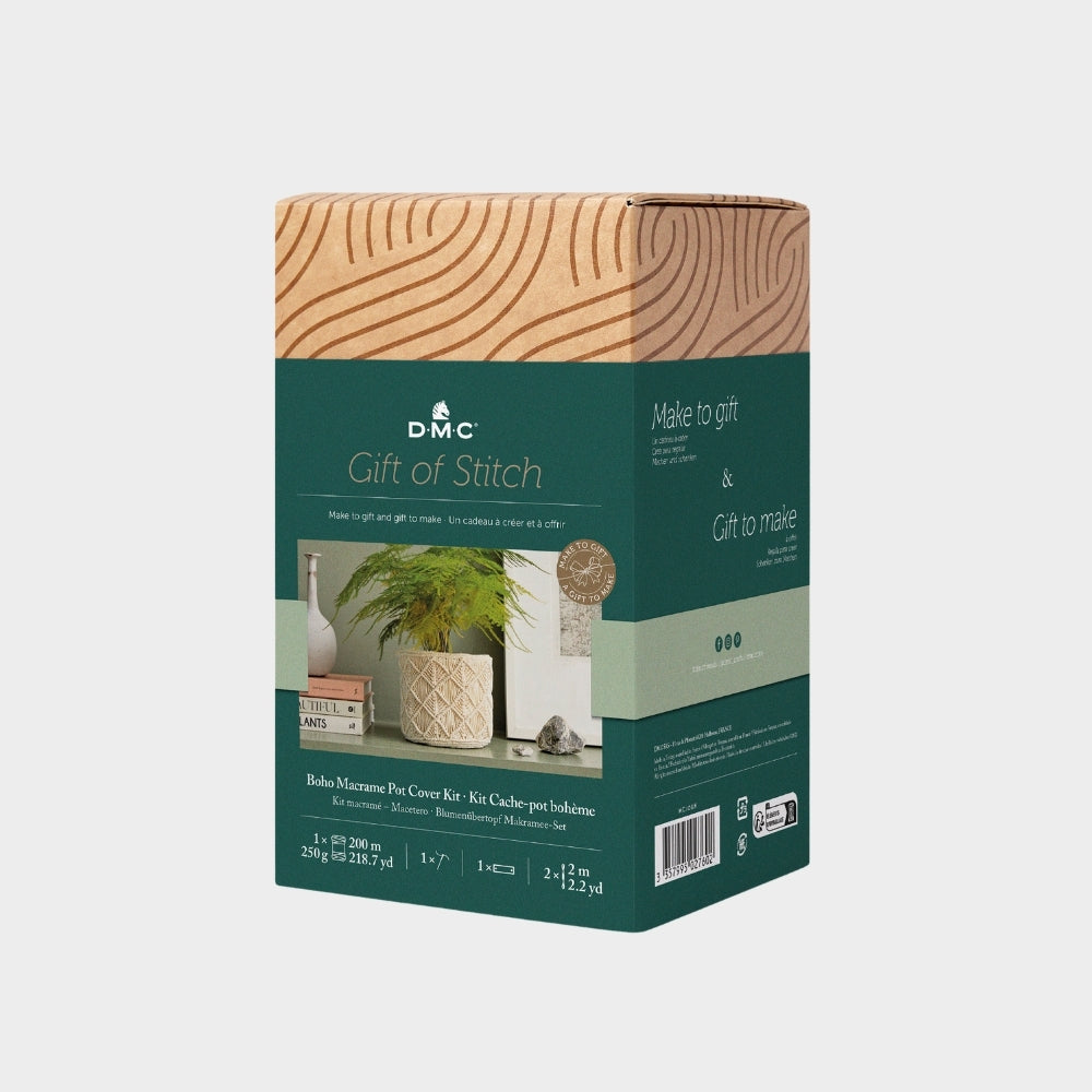 Este kit macramê é ideal para criar e presentear. Faça um desenho de vaso de planta amarrado com fio de algodão reciclado Nova Vita 4. O kit macramê é uma ótima maneira de ser criativo. Além disso, você pode reaproveitar a caixa como embalagem, ela inclui fita e etiqueta bordada.