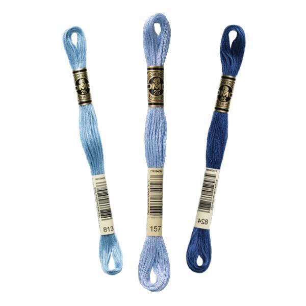Linha de bordar Mouliné Special 117MC, cores da gama de tons azuis, da marca DMC.