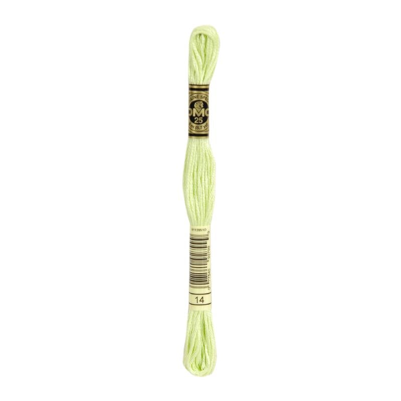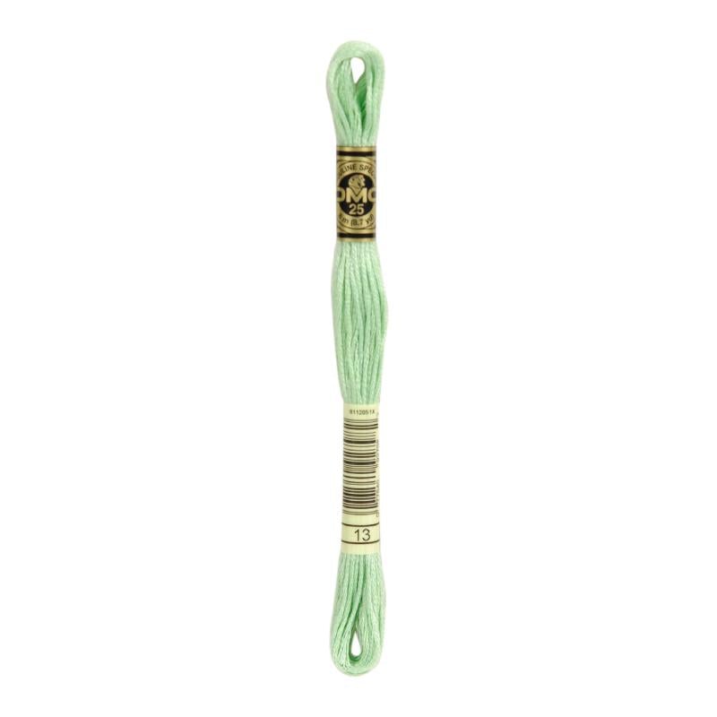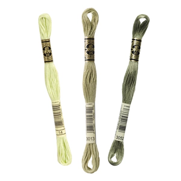 Linha de bordar Mouliné Special 117MC, cores da gama de tons verdes claros, da marca DMC.